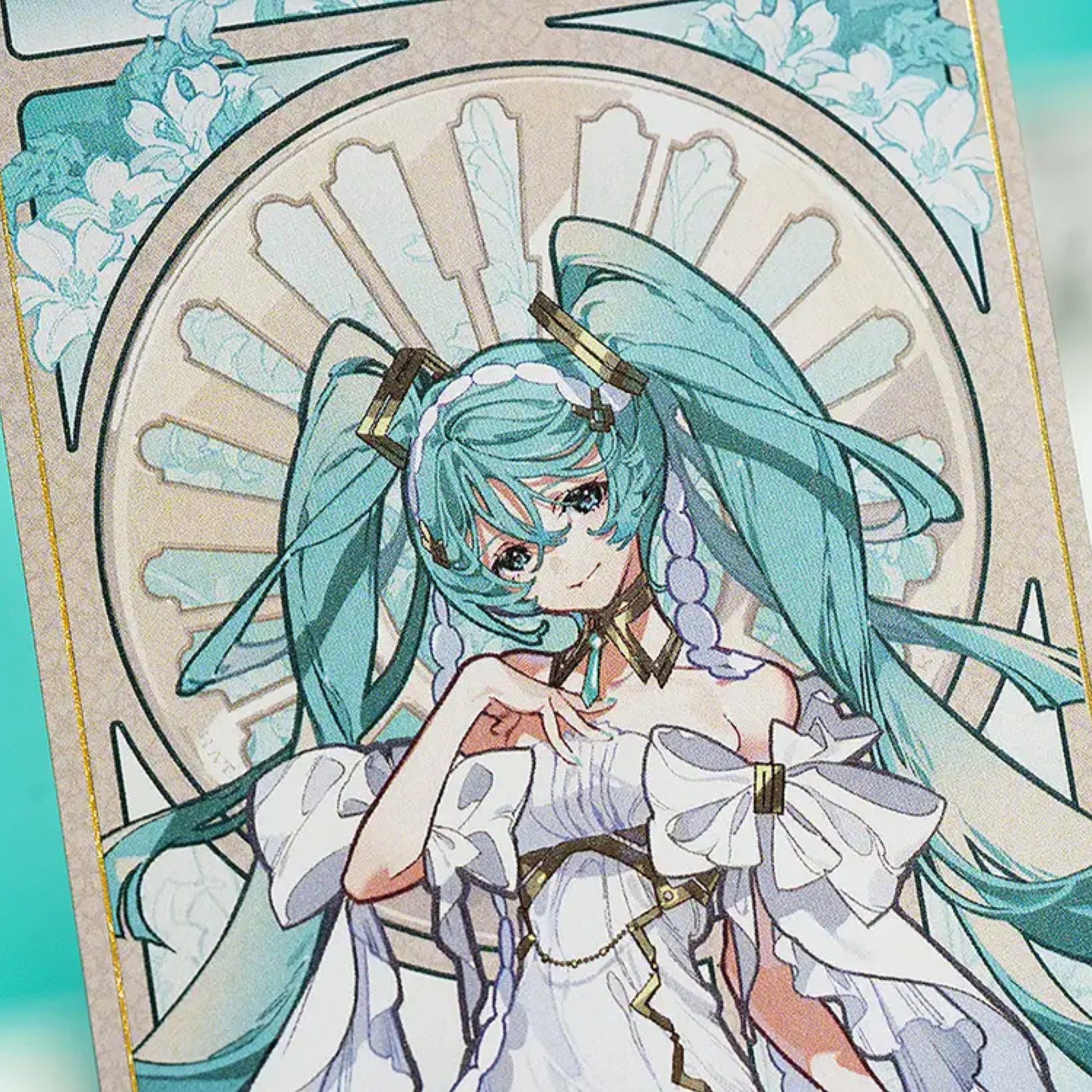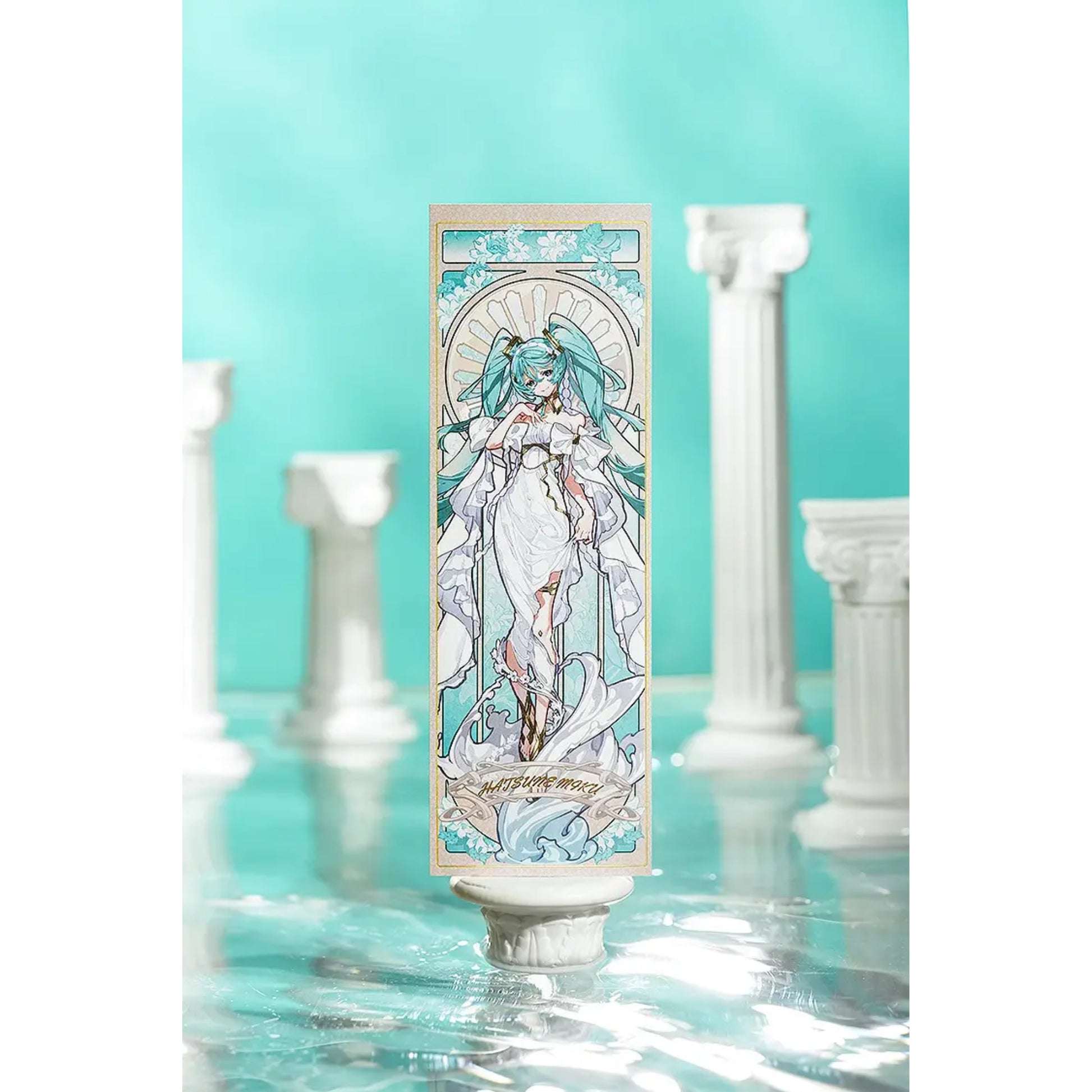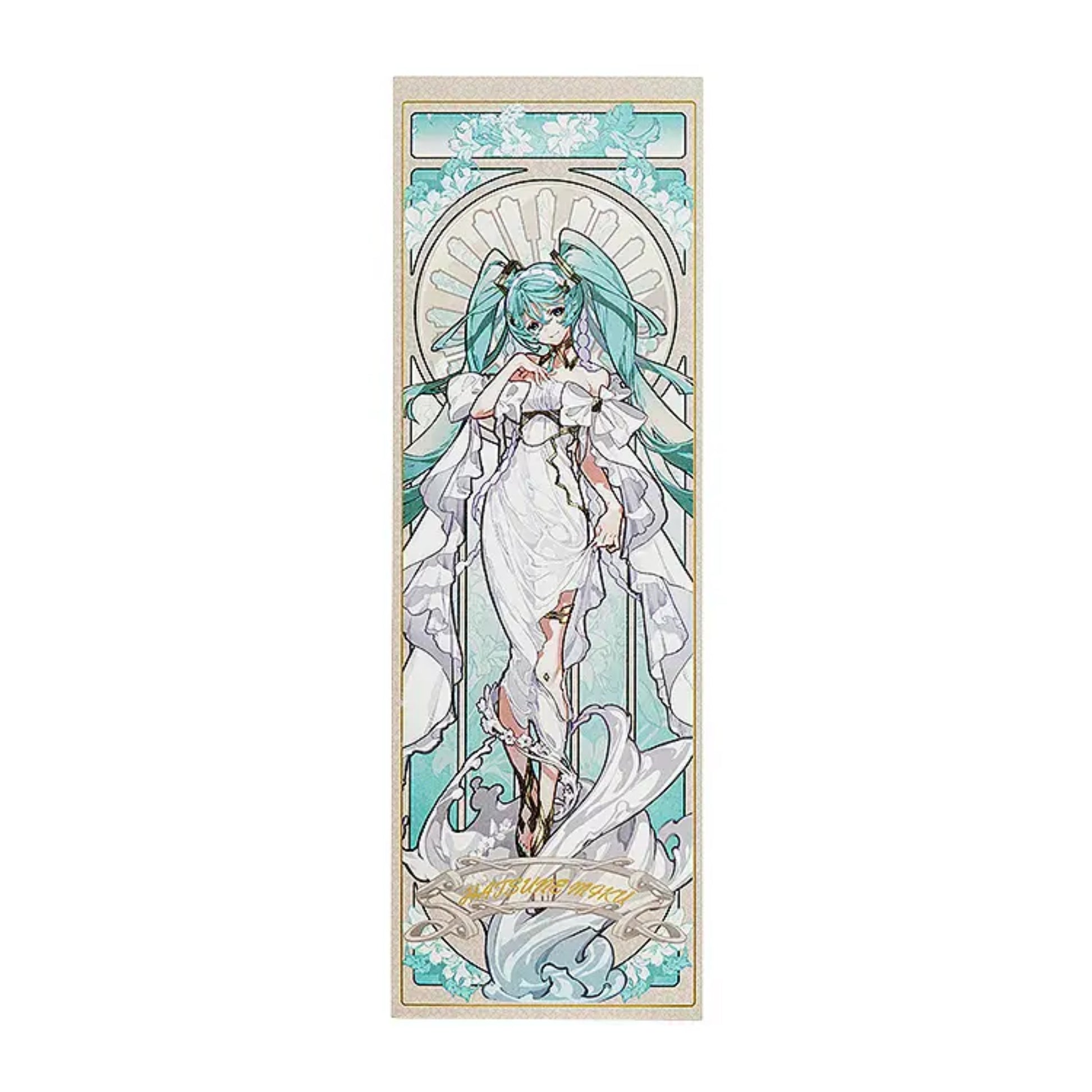 Miku trägt ein elegantes, fast göttliches Outfit und lächelt sanft vor einem kunstvollen Hintergrund, der stark an die Werke von Alphonse Mucha erinnert. Jedes noch so feine Detail der Illustration wurde mit hochauflösendem Druck und aufwendiger Fertigungstechnik eingefangen, ein echtes Schmuckstück für jede Miku- oder Art-Sammlung!